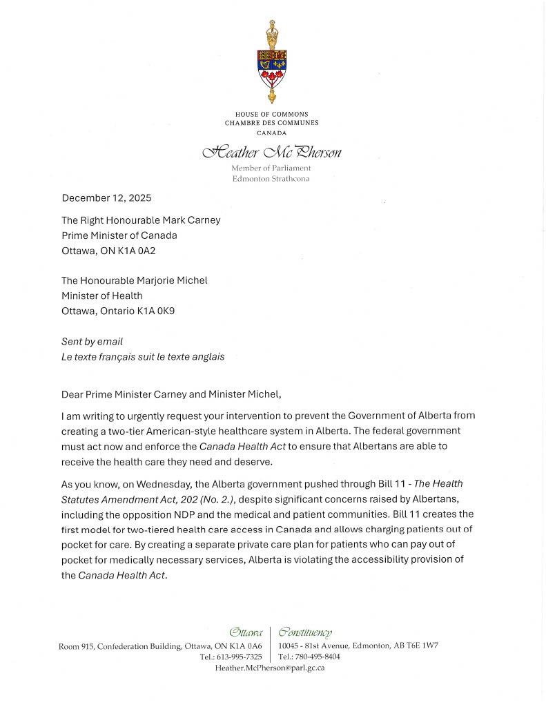 Letter to PM Carney and Minister Michel regarding Danielle Smith's privatization of healthcare in Alberta