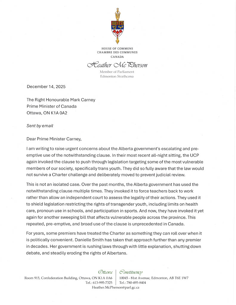 Heather McPherson - Letter to PM Carney - Alberta's use of the notwithstanding clause to discriminate against trans youth
